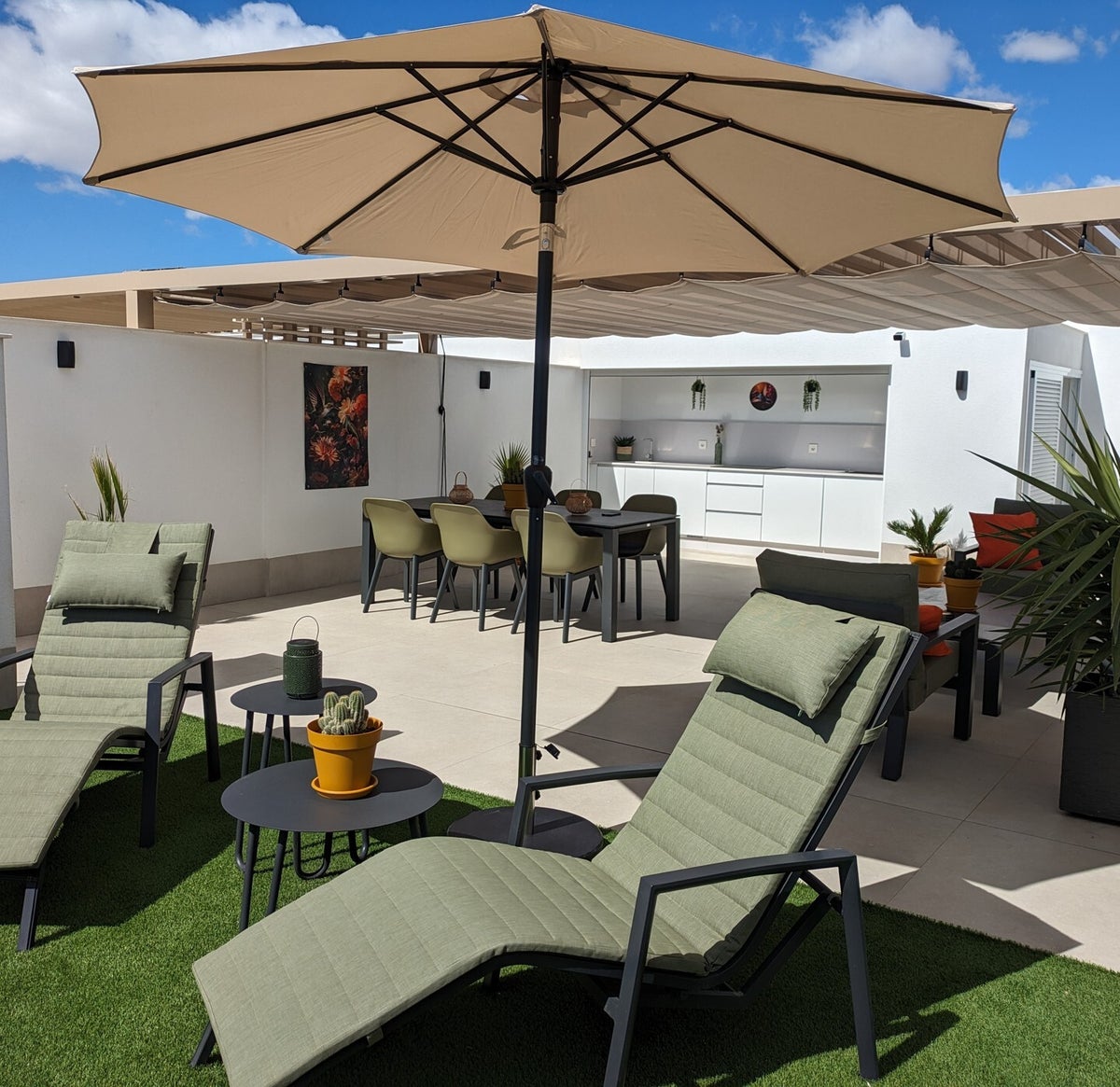 Het penthouse beschikt op de eerste verdieping over een woonkamer met open keuken, 3 slaapkamers en 2 badkamers. Verder beschikt het penthouse over een groot zonnig dakterras met buitenkeuken en ja hoor, zicht op de zee.
