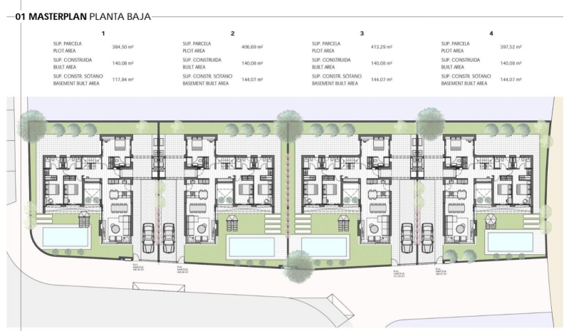 Dit exclusieve project bestaat uit een set van 4 villa's met 3 slaapkamers en 3 badkamers op één verdieping, met een privézwembad van 3 x 7m, een open kelder met licht en ventilatie via een Engelse patio en een groot solarium op een perceel van ongeveer 400 m2. De woningen hebben een volledig uitgeruste keuken en badkamer en pre-installatie van geleide airconditioning.