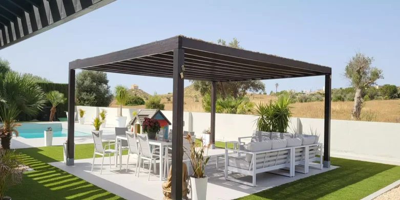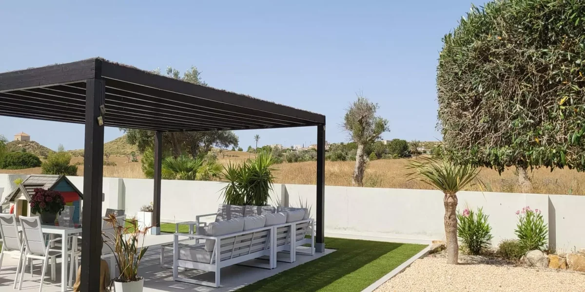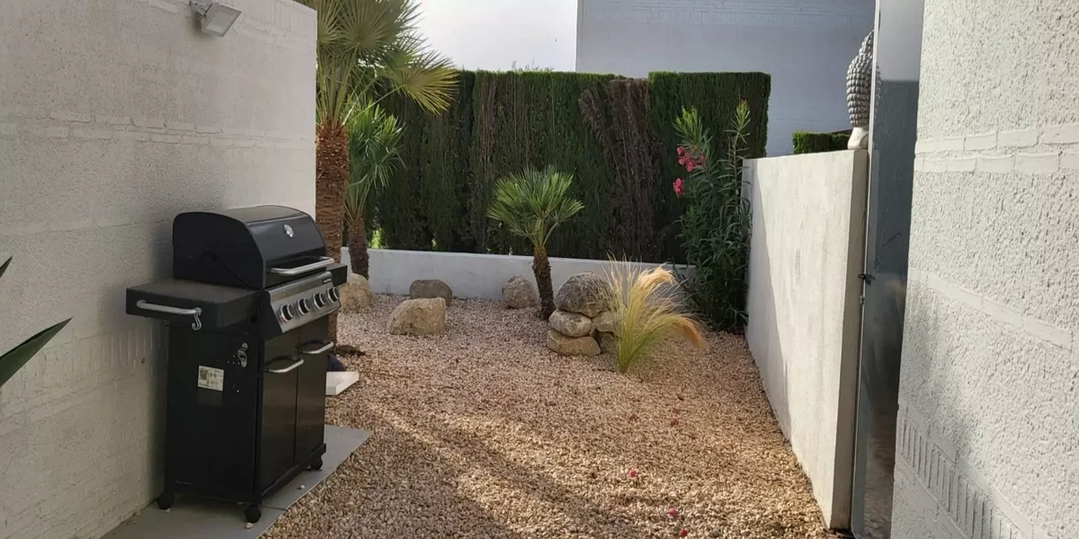 De tuin is privé met volwassen heggen langs de zijkanten, olijf- en fruitbomen en een zwembad van 10 x 5 meter. Er is een overdekte pergola om buiten te eten met een zithoek. Dubbele oprit met elektrische poort en oplaadpunt elektrische auto. Eigen entree met video-intercom. Opslagschuur. Centrale verwarming op gas en warme en koude airconditioning.