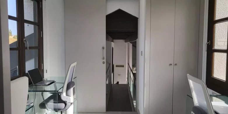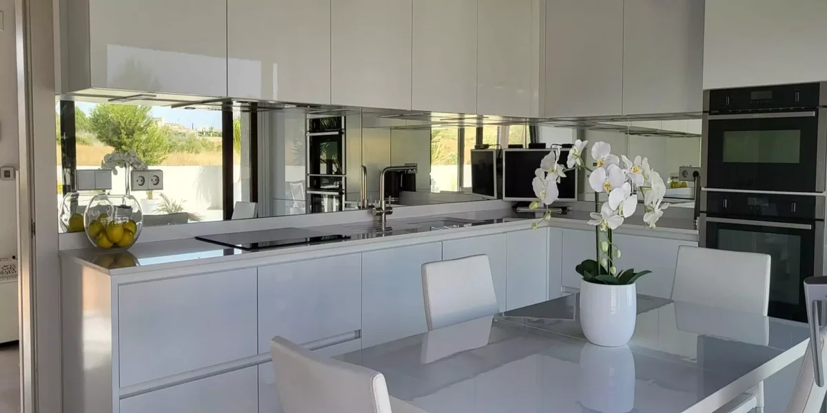 Aan de rechterkant van het huis bevinden zich nog twee tweepersoonsslaapkamers met inbouwkasten, houten balkenplafonds en glazen schuifdeuren naar de tuin. Er is een doucheruimte, gastentoilet en een grote was-/opslagruimte. De volledig ingerichte keuken is in hoogglans wit met geïntegreerde koelkast/vriezer, vaatwasser, NEFF kookplaat, oven en magnetron met een ruime voorraadkast.